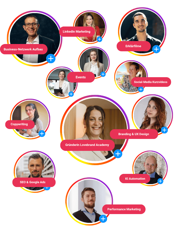 Fast alles! Bei uns gibt es keine “One-Size-Fits-All”-Schablone. Eine Brand zu entwickeln ist so individuell wie dein Fingerabdruck. Anstatt einer Person, die alles ein bisschen kann, hast du bei der Lovebrand Academy für jeden Bereich einen Top-Experten – für maximale Performance. Wir arbeiten nicht auf Bestellung, sondern sind dein Partner auf Augenhöhe. Gemeinsam erarbeiten wir deine Markenidentität und Vermarktungsstrategien.